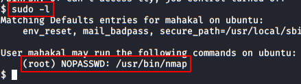 We do a “sudo -l” and see that we have permission to run the nmap binary as root and without a password.