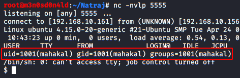 We go back to our shell with Netcat and check that we are already inside the machine with the user account “mahakal”.