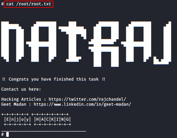 And having already hijacked the root account, we only have to read the flag and complete this great machine.