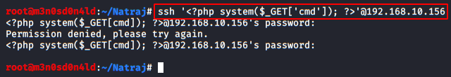After this, we can try writing PHP code inside the SSH command for the connection: