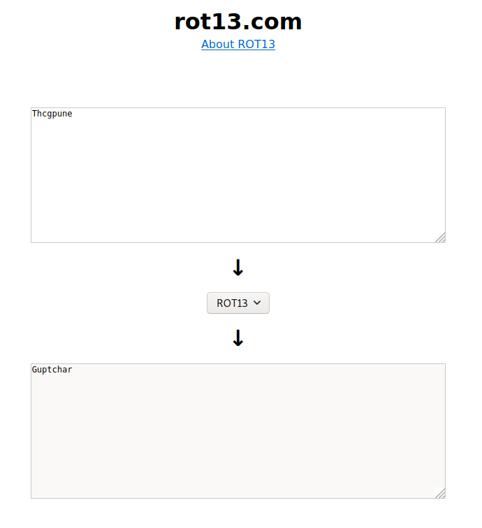Copy the text that we have found in the notepad and let’s try converting it using rot13 and there you find a text that says Guptchar. Guptchar is a Hindi word for the detective. And it looks