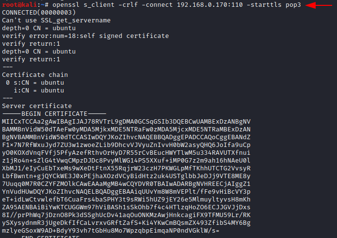 openssl s_client -crlf -connect 192.168.0.170:110 -starttls pop3