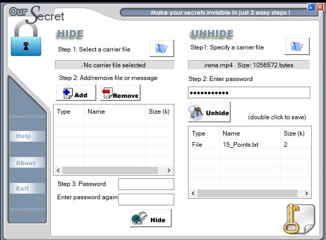 We can then use the password “BASKERVILLE’ to decrypt the.mp4 file and see that there is a file with the name 15_points.txt. You can make use of OurSecret steganography tool to unhide the contents behind the video file. You can download it from here.