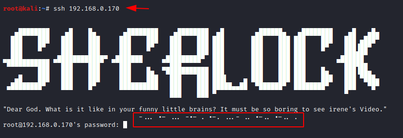 After watching the video, we realize that there is nothing present in the video, so we move onto the ssh service. On doing that we see a banner named sherlock and we see that there is a hint in the form of “morse code”.