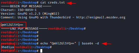 Here we find a fake PGP message that contained a base64 code, which we then decoded.