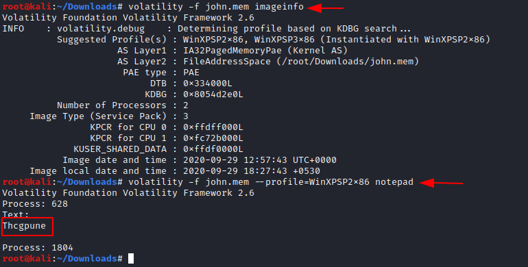volatility -f john.mem –profile=WinXPSPx86 notepad