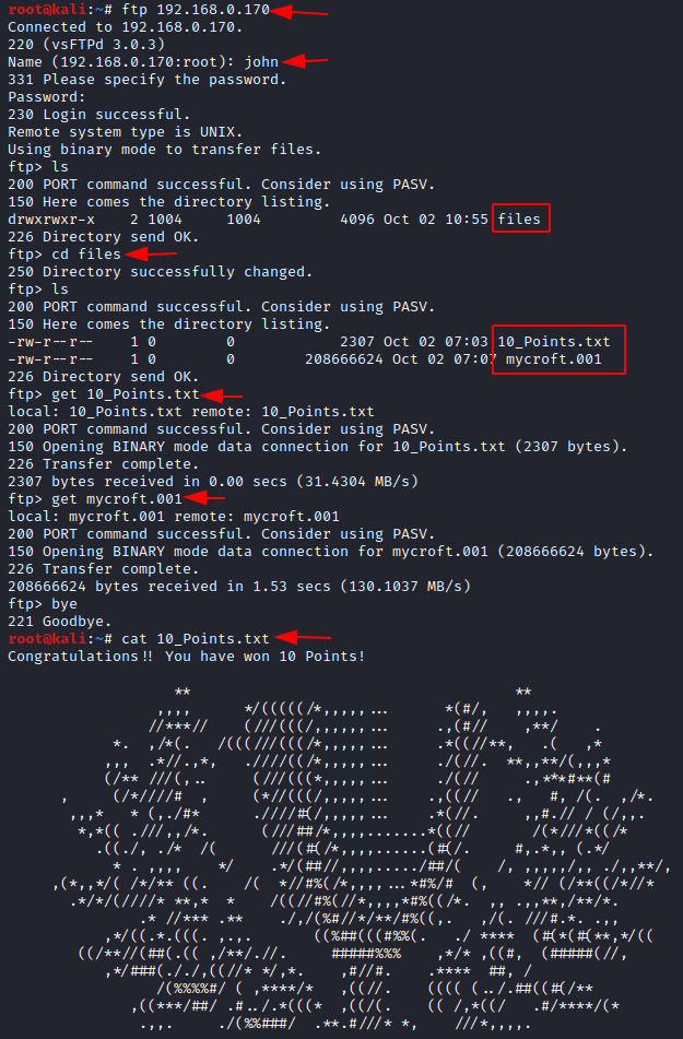 Moving forward, we should think like sherlock. Make the username as John and can use Guptchar as the password. If you go back and remember, we had seen the FTP port to be open and let us connect to FTP.