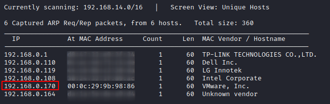 So, let’s start with finding the IP address of the vulnerable machine by performing a network scan by using Netdiscover command. Here we need to understand how the scanned IP addresses relate to their MAC addresses. Here we choose the IP address 192.168.0.170 whose Hostname is a VMware machine. To do this, you can type: