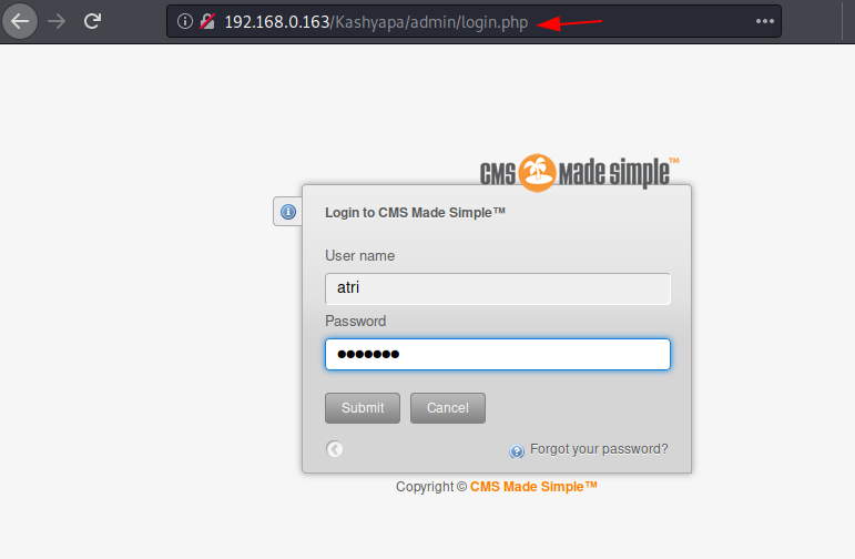 Then you can go to the web page and add /admin/login.php to open the login page of the Virtual machine. Enter the username and the passwords that were found.