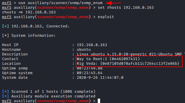 use auxiliary/scanner/snmp/snmp_enum set rhosts 192.168.0.163 exploit