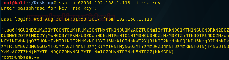 scp -P 62964 64base@172.16.0.19:/var/www/html/admin/S3cR37/flag5* \ > /root/Desktop/flag5.jpeg