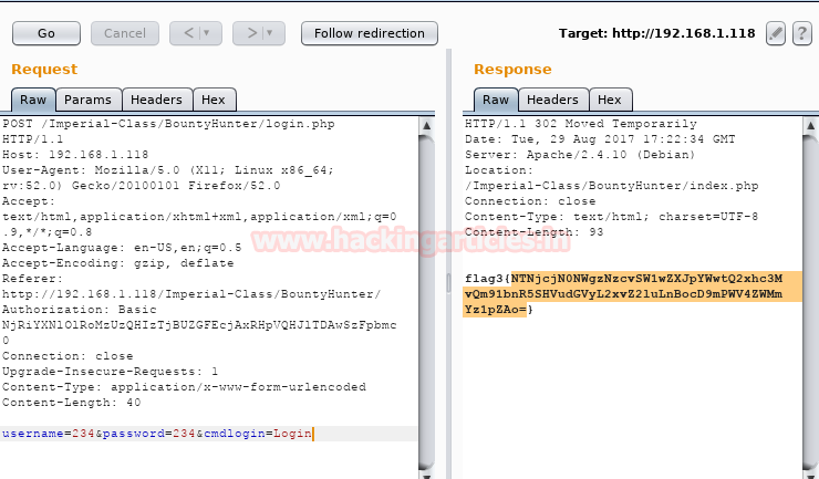 After capturing the request we sent it to repeater, here in the response we get the 3rd flag. Inside the flag we see a base64 encoded string.