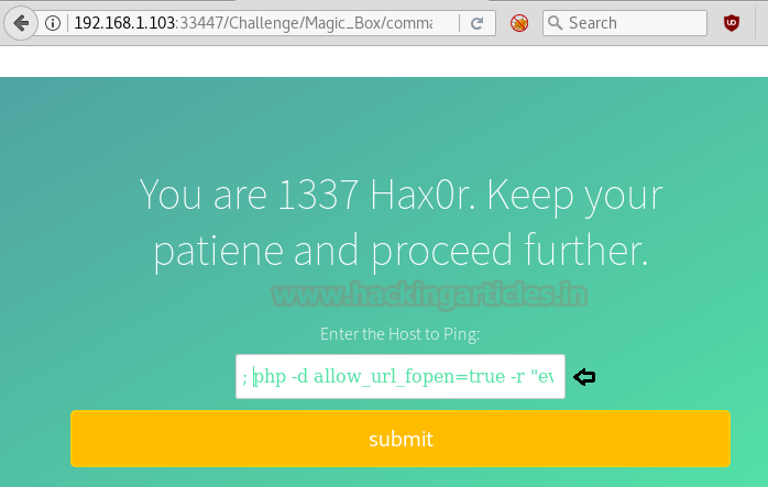 Now performing this exploit will give you a code. Copy this code and paste it on the ping portal after the IP that you are using to ping. And to add this code use semi-colon (;).