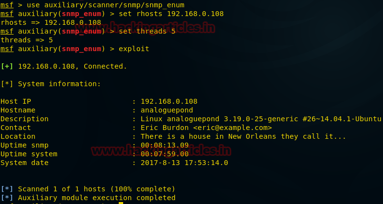 use auxiliary/scanner/snmp/snmp_enum msf auxiliary(snmp_enum) > set rhosts 192.168.0.108 msf auxiliary(snmp_enum) > set threads 5 msf auxiliary(snmp_enum) > exploit