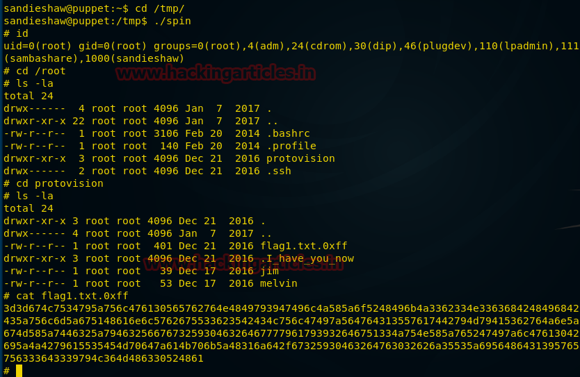 Now we have the root shell, moving into the /root/protovision folder we found a flag that is hexadecimal format.