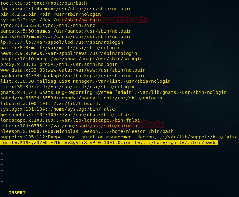 Linux uses md5 salt hashes as password so we create an md5 hash using ignite and xyz as salt.