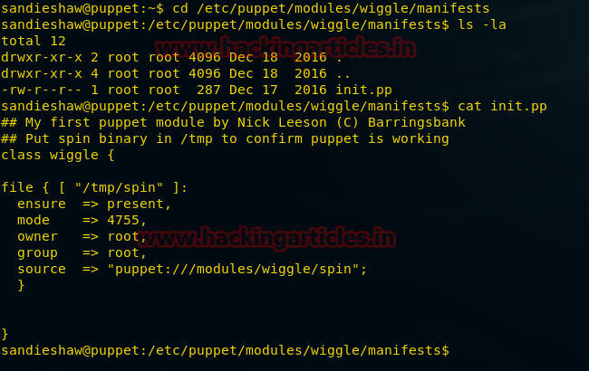 Among those files we find that a puppet file contains instructions to copy spin file in root access after ensuring it is present in the /tmp/ folder of the system.