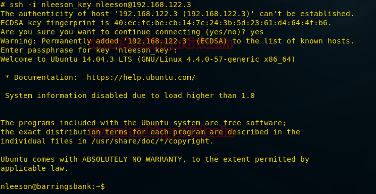We connected to the system 192.168.122.3. After looking around we couldn’t find anything, so we went back into the root of 192.168.122.2. Here after looking through the files we found that 192.168.122.2 was the puppet server and 192.168.122.3 was the puppet client. We found a file called barringsbank-passwd that held all the username and password of 192.168.122.3.