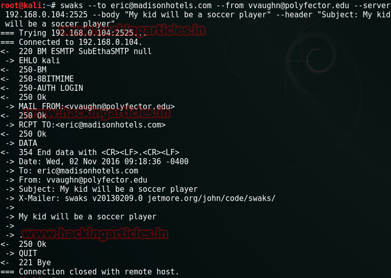 swaks --to eric@madisonhotels.com --from vvaughn@polyfector.edu --server 192.168.0.104:2525 – body "My kid will be a soccer player" --header "Subject: My kid will be soccer player"