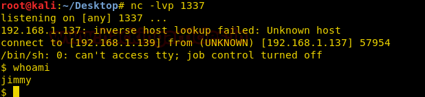 Now we set up our listener using netcat and wait for the cronjob to execute our file. Once the file is executed we get our reverse shell as a different user.