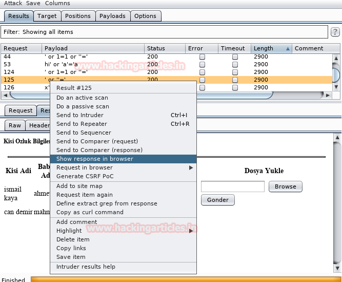 Use brute force to apply SQL injection. (When asked for text file for brute-force, select the one with the list of all SQL injection commands)