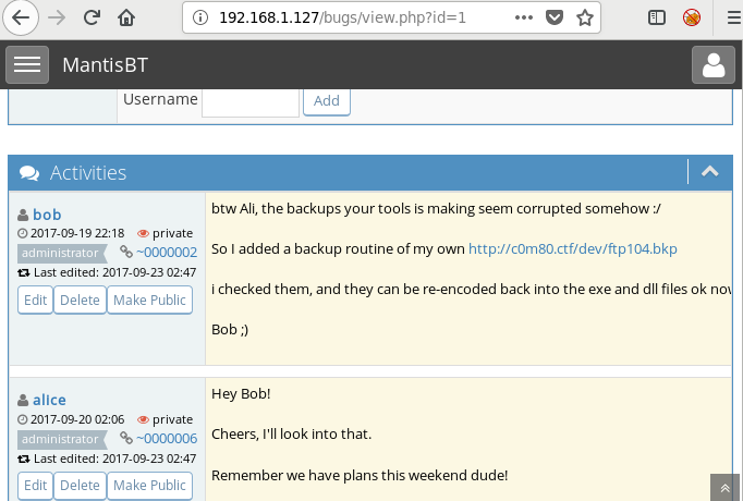 We find a link to a login page that is running mantis bug report. We find that the version is vulnerable; we can reset the password of the users with this vulnerability. You can read how to exploit this vulnerability here.