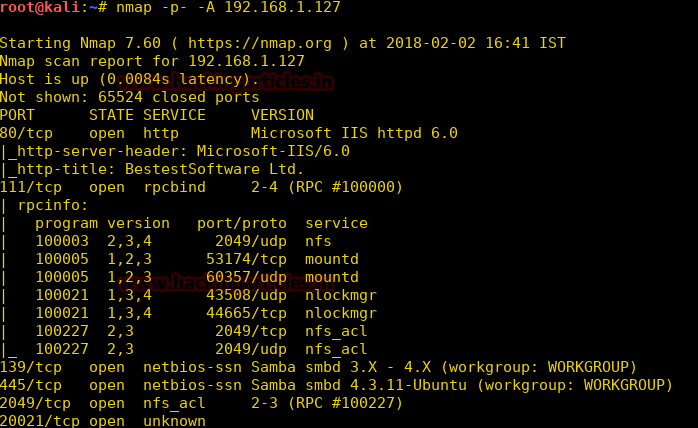 We find that port 80, 111, 139, 445, 2049, 20021, 37196. 40325, 41605, 49418, 58563 are open. As port 80 is running http we open the ip address in our browser.
