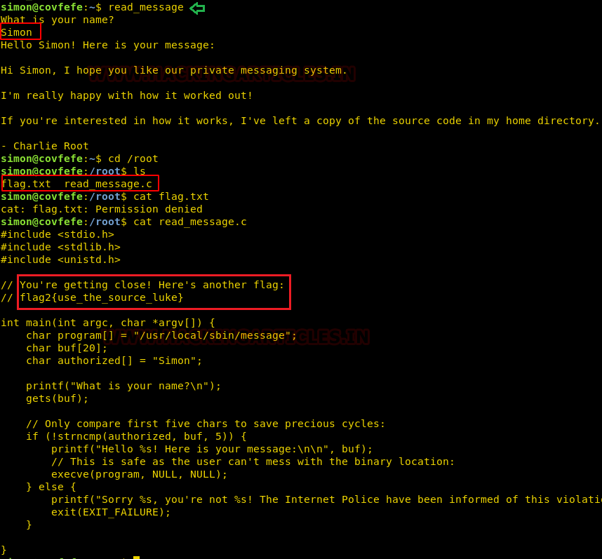 Again when we open ‘read_message’ and provide ‘Simon’ as username, we get a message with a hint that we can find something in the root. Now when we enter the ‘/root’ folder and list its content we find two files named ‘flag.txt’ and ‘read_message.c’. We can’t access flag.txt yet. Moving on, inside ‘read_message’ we find our second flag.