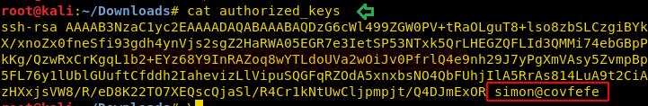 When we open authorized_keys we find a username ‘simon’ for the private key.