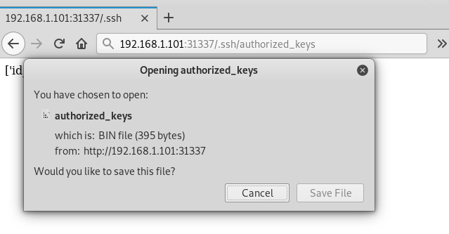 We get a download prompt while opening ‘authorized_keys’ in the browser so we download it. We downloaded id_rsa too in the same way.