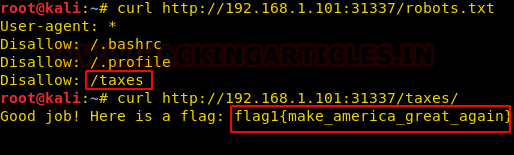 Further enumeration of robots.txt using curl shows a file “/taxes” among others. And as soon as we open it, we get our first flag.