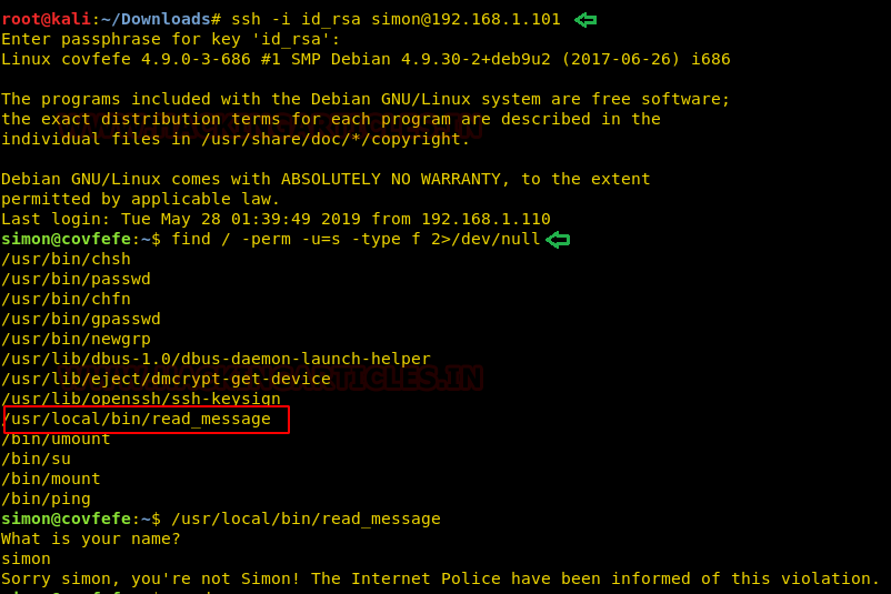 ssh -i id_rsa simon@192.168.1.101 find / -perm -u=s -type f 2>/dev/null