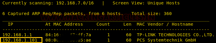 Let’s start off by scanning the network and identifying host IPs. As illustrated below, we can identify our host IP as 192.168.1.101.