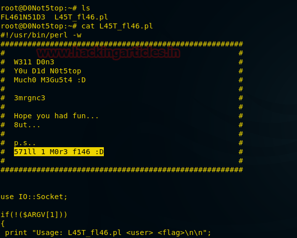 Now in D0Not5top terminal, we will open file L45T_fl46.pl with IP 192.168.0.7 (Kali Linux IP) as given below: