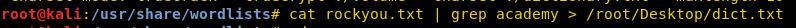 cat rockyou.txt | grep academy > /root/Desktop/dict.txt