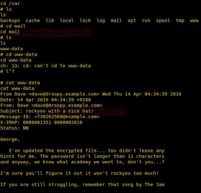 And then we will go into the /var by typing cd /var and then type ls to view its content. Now, let’s go into the mail by typing cd mail and then ls to view its content. And the type cat www-data to read whatever’s inside it.