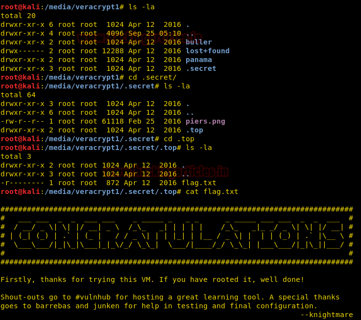 Open its path in the terminal of kali and type ls -la to view the files. Open secret by typing cd .secret and the type ls -la to see its content. And then open .top by typing cd .top and then type ls -la to see all the files in it. There you will find flag.txt, type cat flag.txt to view the flag.